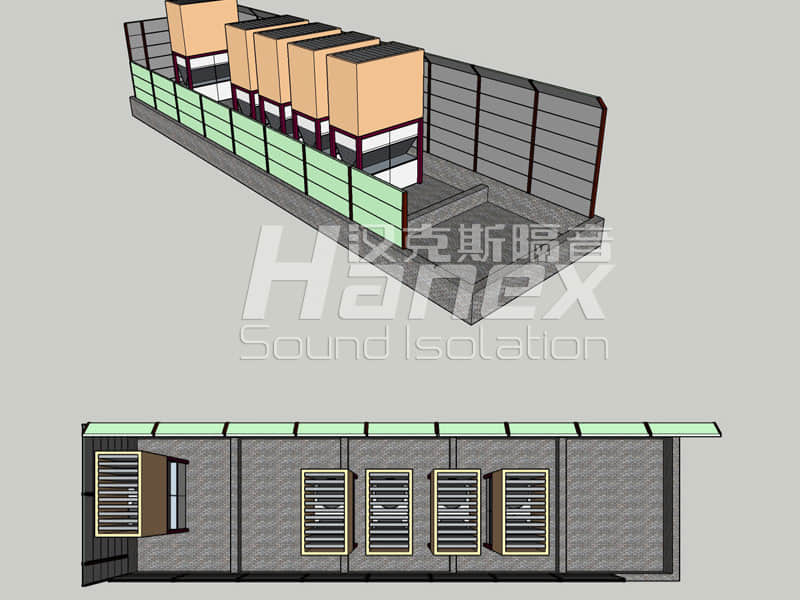 安裝出風(fēng)消聲器后,設(shè)備出風(fēng)口噪聲大幅度的降低,為進(jìn)一步提高降噪效果,同時保障設(shè)備正常運行,在設(shè)備的北面與西面安裝高3.5米的吸隔聲屏障。設(shè)備的南面安裝高1.5米的聲屏障。屏障采用H型鋼立柱,安裝在女兒墻上。
